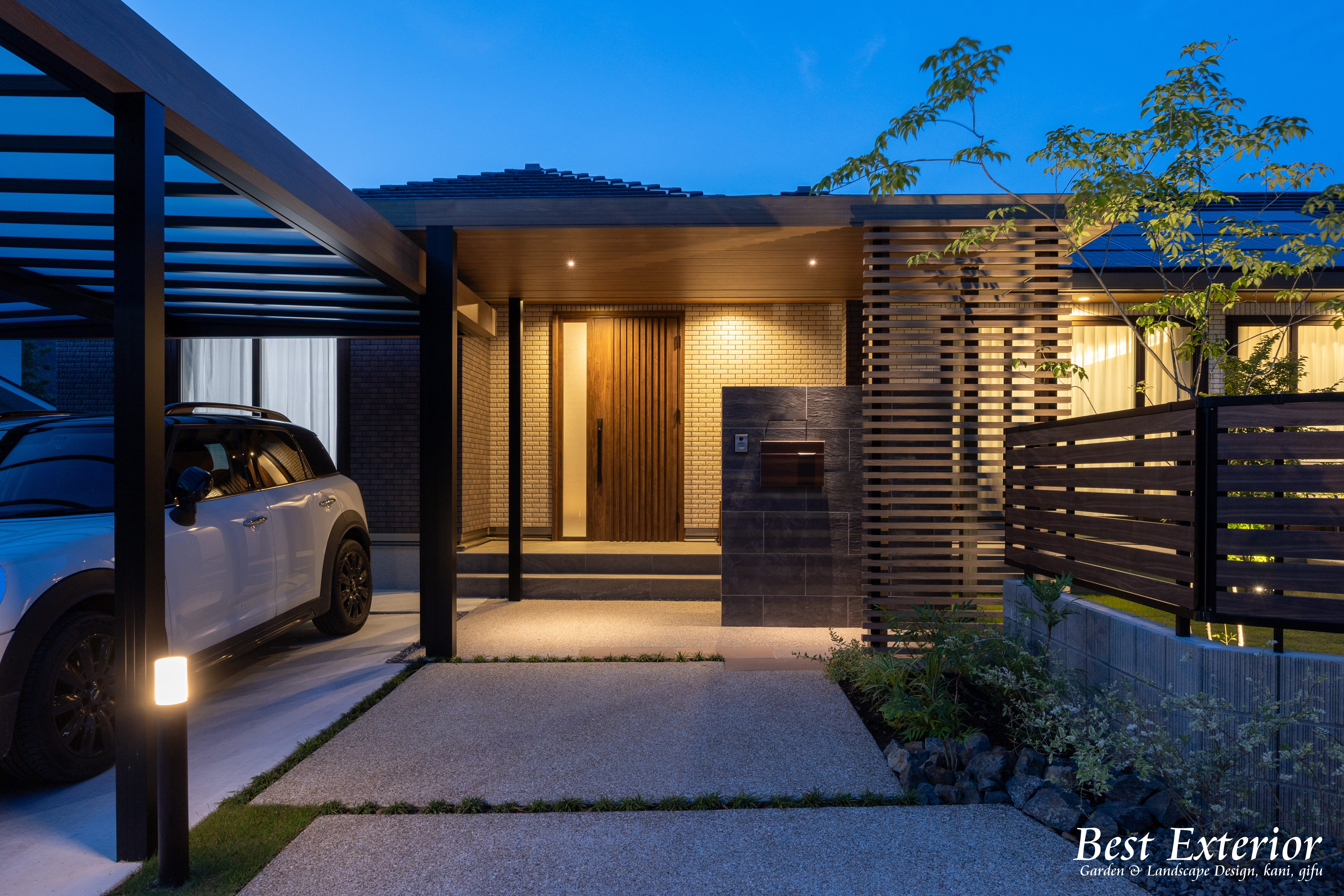 緑と照明で彩る街並みと繋がるセミクローズ外構