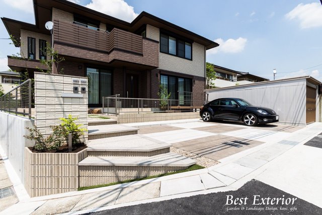 建物の意匠を引き立てるカラーコーディネートされた外構
