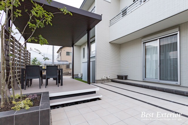 リビングとの間を同系色の明るいタイルデッキで繋ぎました。