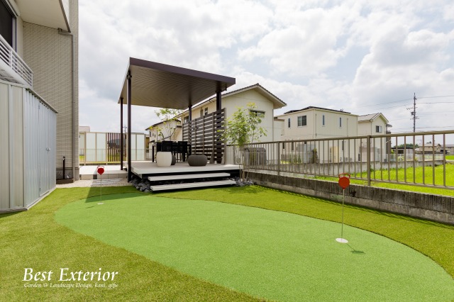 庭の奥には 趣味であるゴルフのグリーンを人工芝で再現し、植栽と合わせ見た目も彩り豊かなスペースも設けました。